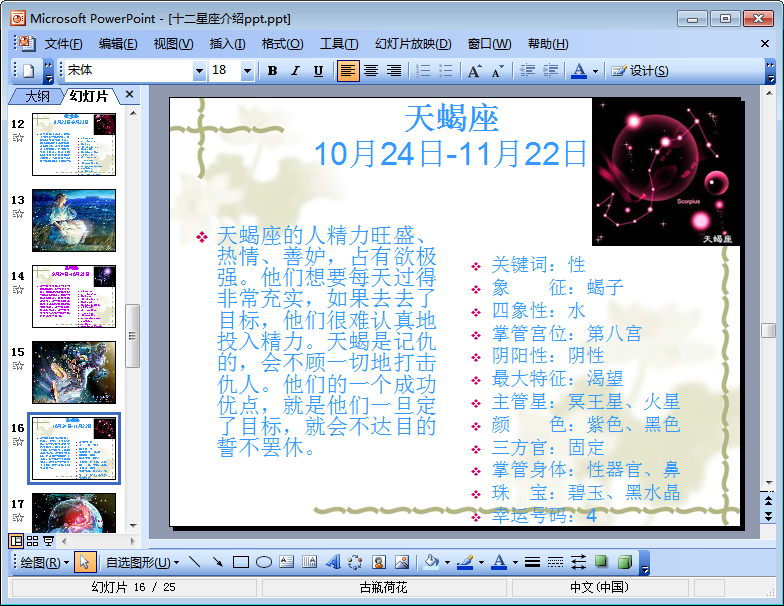 这是一份介绍十二星座的ppt,该ppt对十二星座对应的出生日期、性格特征等都做了详细的说明,如果你想知道白羊座男生或是女生的性格,如果你想知道什么时候出生的人才是摩羯座,那么小编建议你千万不要错估了这份十二星座介绍ppt哦!该ppt共由25页组成,内容完全免费,欢迎有需要的朋友们前来下载!