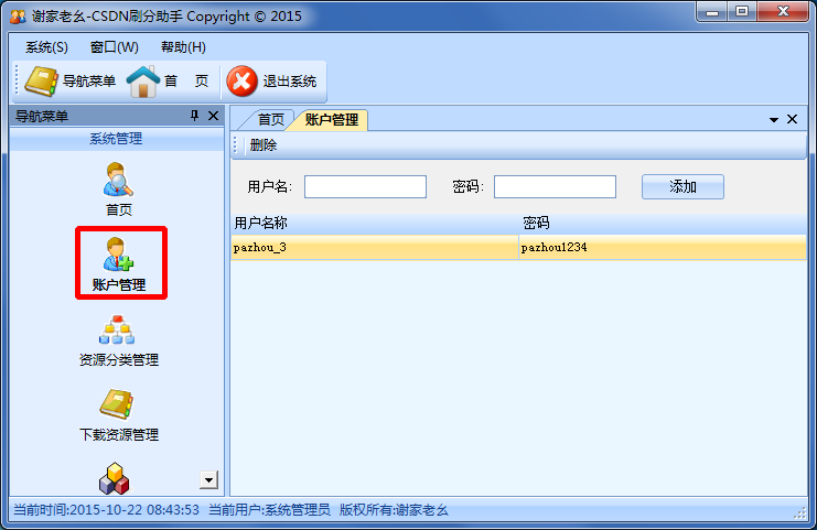 1、账户管理:你可以在此模块中添加多个csdn账号密码;