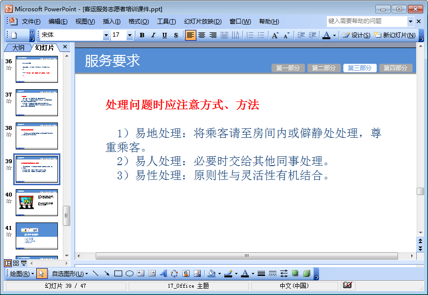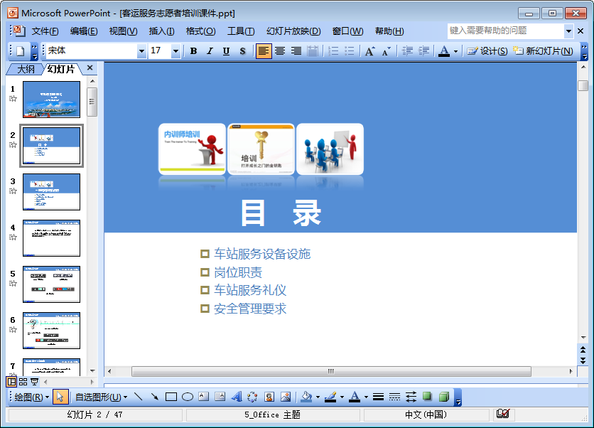 作为一名客运服务志愿者,他们在工作的时候有什么是需要的做的,又有什么是不能做的呢?本节内容小编为大家整理带来的是一份客运服务志愿者培训课件ppt,该ppt从车站服务设备设施、岗位职责、车站服务礼仪、安全管理要求四大方面详细介绍了客运服务志愿者的工作职责和要求,感兴趣的朋友不妨随小编一起来了解一下吧!