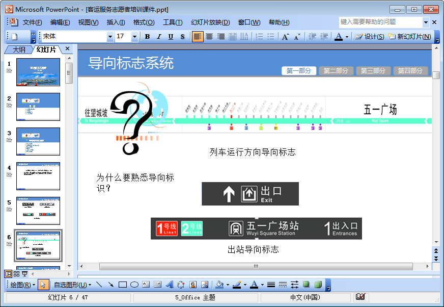 为引导乘客方便、快速、安全地进站乘车、搭乘列车、下车出站、换乘、使用车站设施、观光等行为,而连续设置于地铁站外、站内、列车上的各类标志,以及完成紧急情况下进行客流疏散所设的紧急疏散标志。