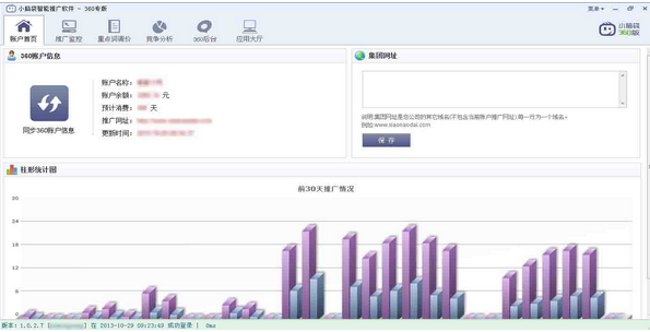显示360账户余额、推广网址、近30天点击消费及账户树结构信息: