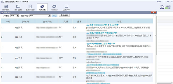 通过输入关键词及选择分析地域,可将词关键词目前的展现情况分析出来并支持创意信息的导出,多个关键词可直观的了解竞争对手的竞争度,知己知彼