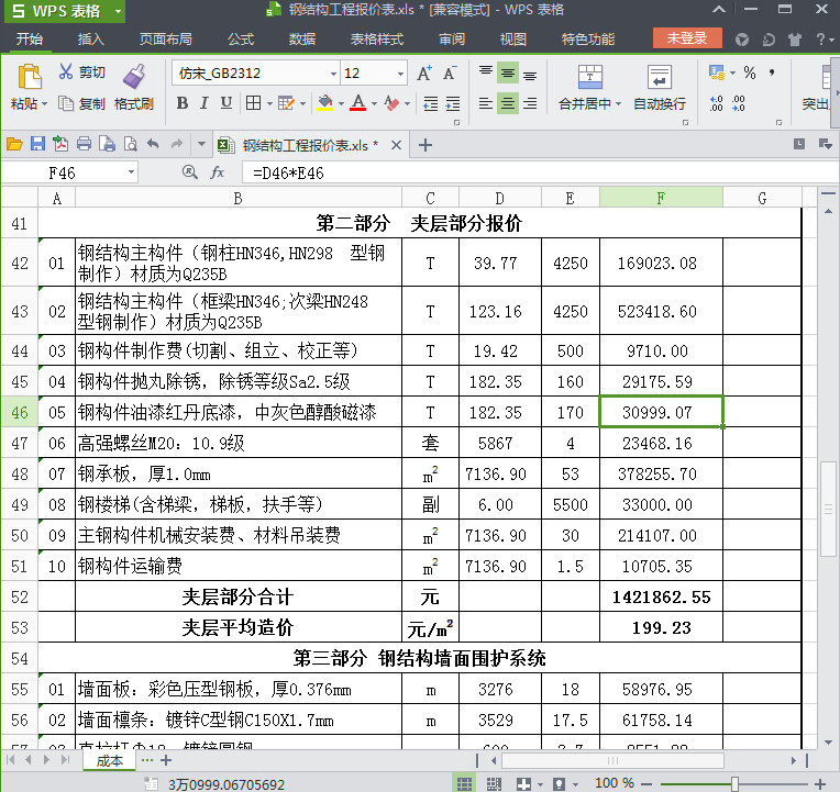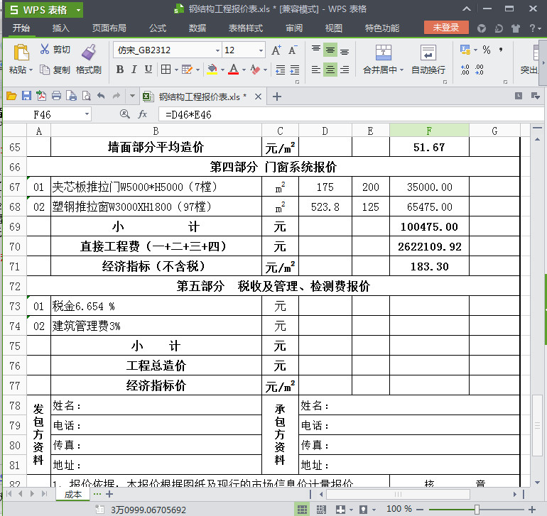 钢结构工程报价明细样表,一份购买不同种类钢材的预算清单,十分的详细,根据钢构件材料及制作费、钢结构连接系统、钢结构屋面围护系统、夹层部分报价、钢结构墙面围护系统、门窗系统报价、 税收及管理、检测费报价进行分析。非常恰当。欢迎前来东坡下载。