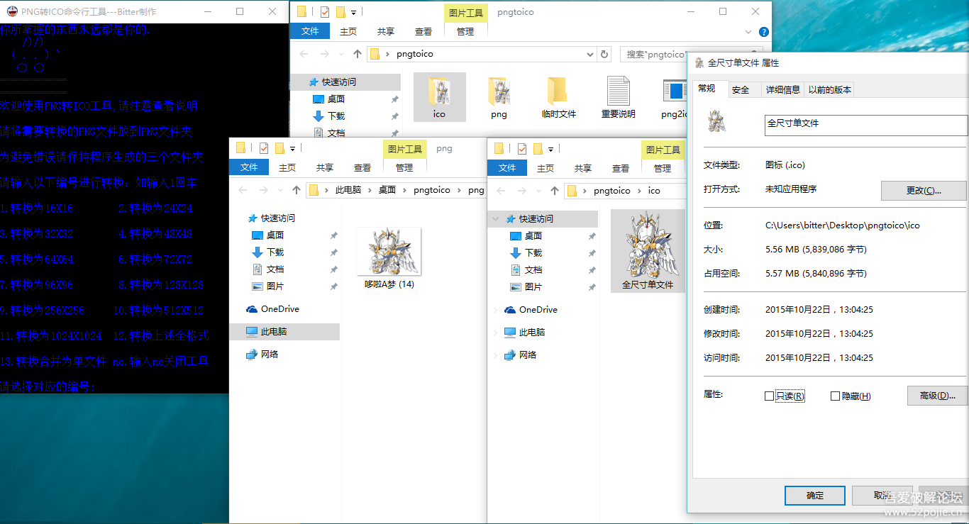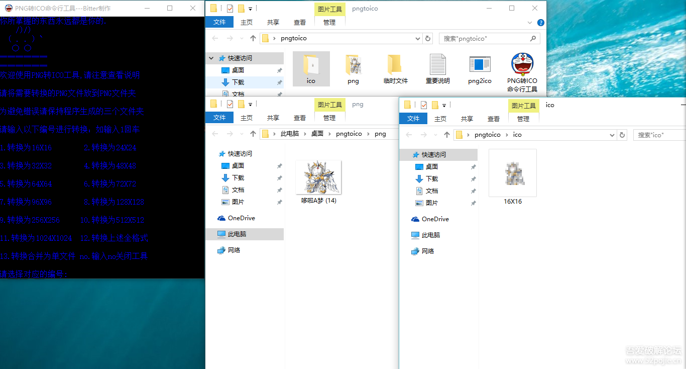 其中PNG转ICO命令行工具是主程序。双击运行,第一次运行会生成PNG目录,ICO目录,临时文件夹,并打开PNG目录以便你拖放PNG文件。