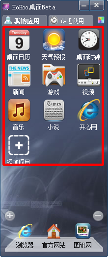 HoHoo桌面是由HoHoo日历衍生出的一款仿iphone桌面管理平台,不仅包含了日历等所有HoHoo相关桌面组件,还可以让您更安全方便启动电脑里的软件、应用和网址,让您体验前所未有的便捷;另外,还为您提供了众多耳目一新的应用,您可以在桌面上看新闻、听音乐、看电影、玩小游戏。