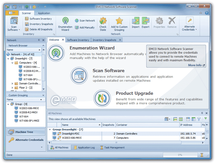 EMCO网络软件扫描器的设计在本地网络中执行基本的软件审计业务。你可以使用它从电脑位于Windows域和工作组提取安装软件。所有与网络电脑的操作进行远程和无形的终端用户。无客户端安装或特殊配置需要收集软件清单数据远程网络的电脑。