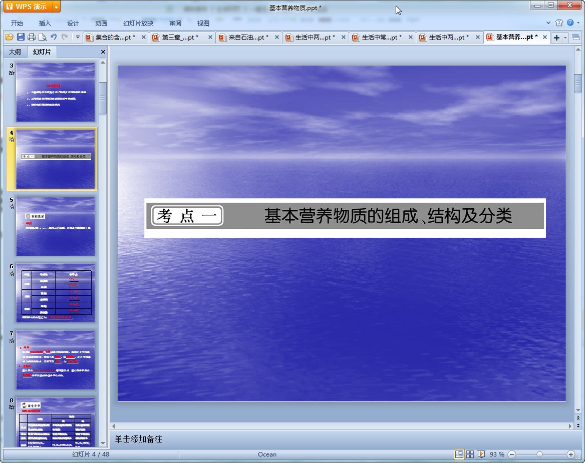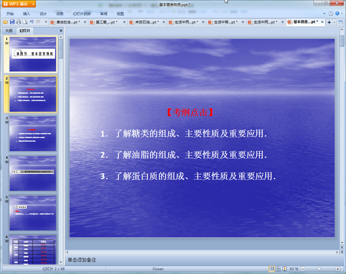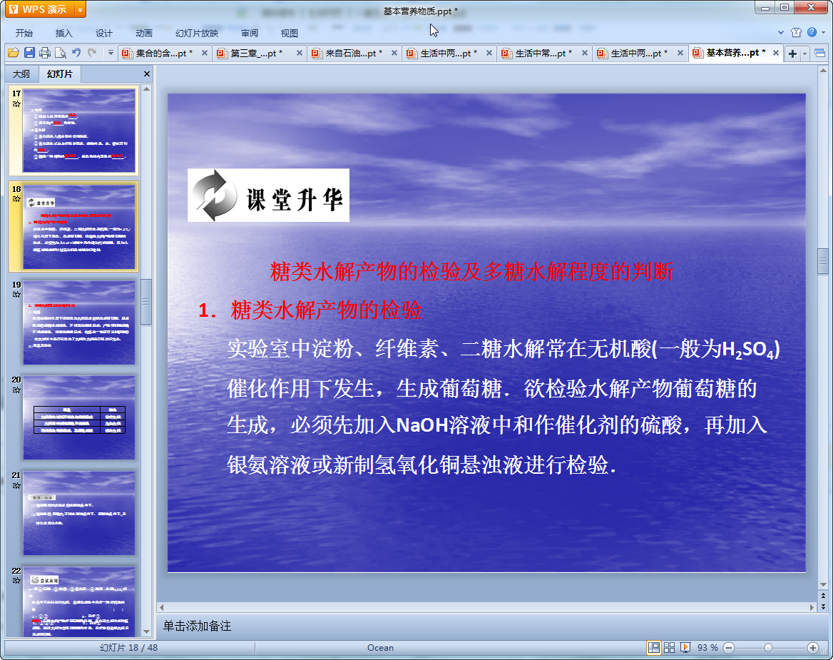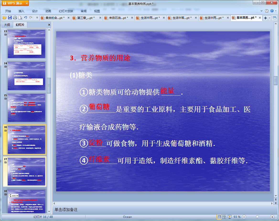 这是一篇高中化学中的基本营养物质教学课件,该课件共有48页内容制作比较精细,对课本上的知识点归纳的也十分齐全,采用蓝色的背景不花哨深受学生们的喜爱,有兴趣的老师门可以来下载使用!