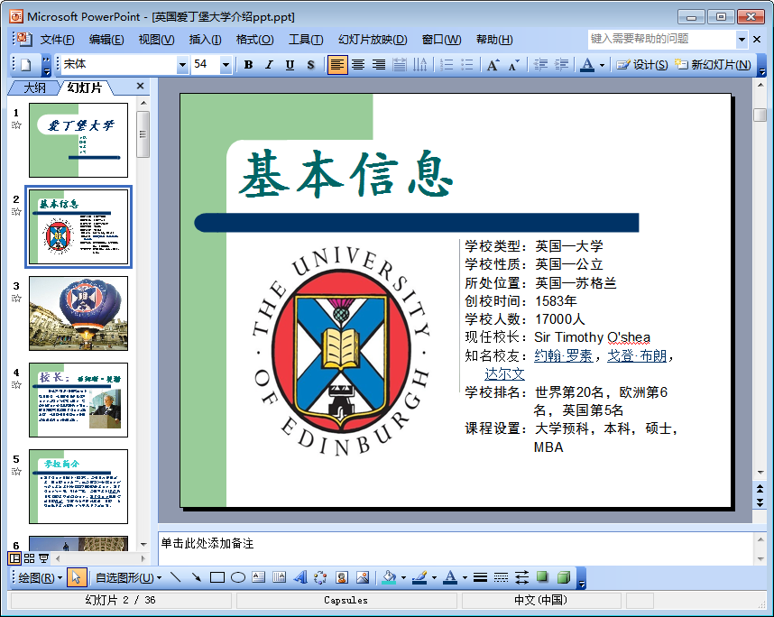 该ppt从学校基本信息、学校简介、校长、杰出课程、学院设置、知名校友等方面对英国爱丁堡大学进行了全面详细的介绍,如果你想对英国爱丁堡大学有更多地了解,如果你需要一份介绍英国爱丁堡大学的ppt,那么这份内容完全免费的、共由15页组成的英国爱丁堡大学介绍ppt将会是你一个不错的选择哦!
