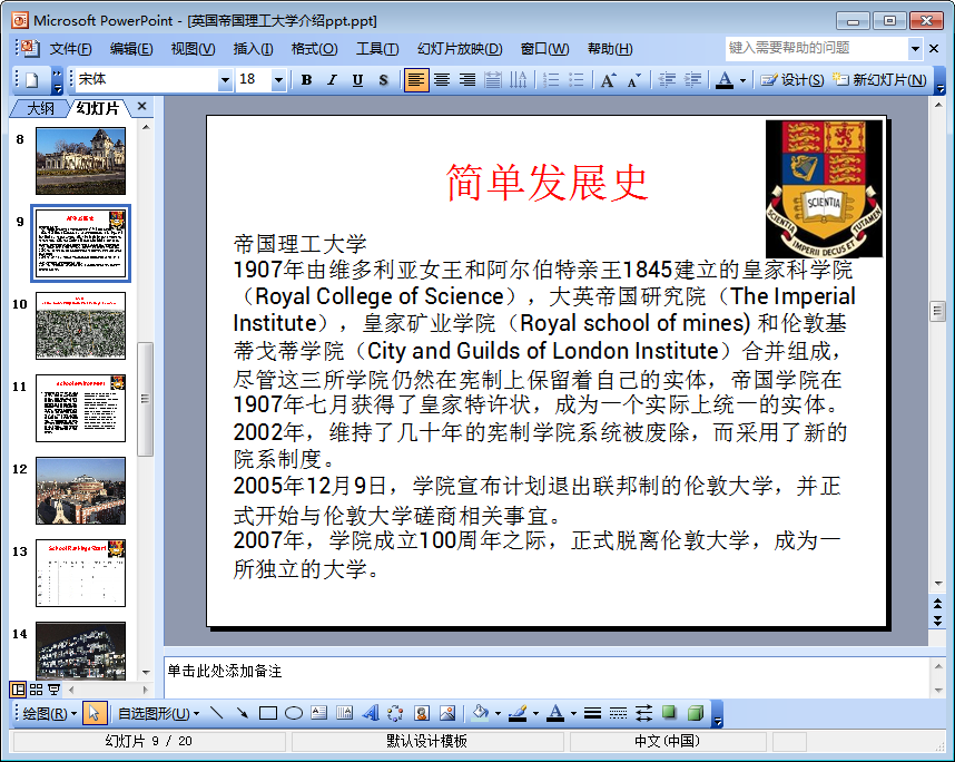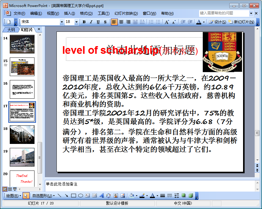 Science is the imperial glory and guardian(科学是帝国的光彩和守护者)——这是一份介绍英国帝国理工大学的ppt(以下简称为帝国理工大学介绍ppt),想要知道帝国理工的相关历史吗?想要知道帝国理工大学的每年收入吗?如果你的回答是肯定的,那就来这份共由17页组成的帝国理工大学介绍ppt中一探究竟吧!相信它不会让你失望的哦!