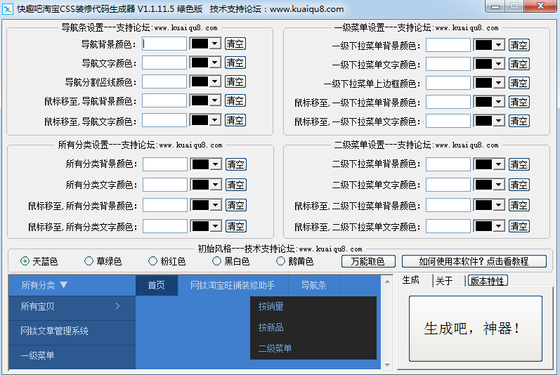 快趣吧淘宝导航css代码生成器就是现在操作十分的简单的导航css代码生成工具。不但能调导航条的文字颜色,而且还拥有颜色提取器,从而更快速的生成所需要的代码!