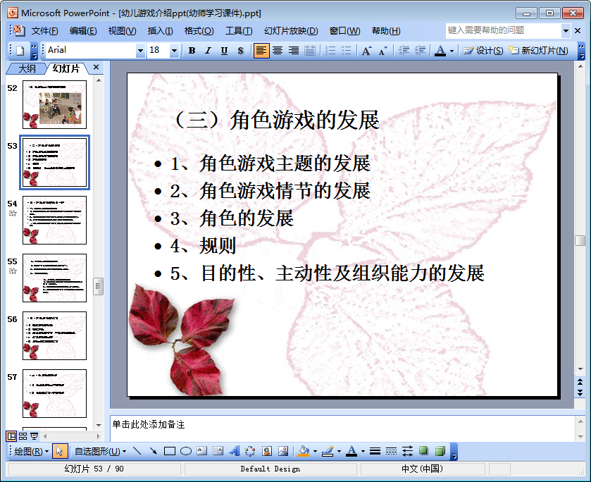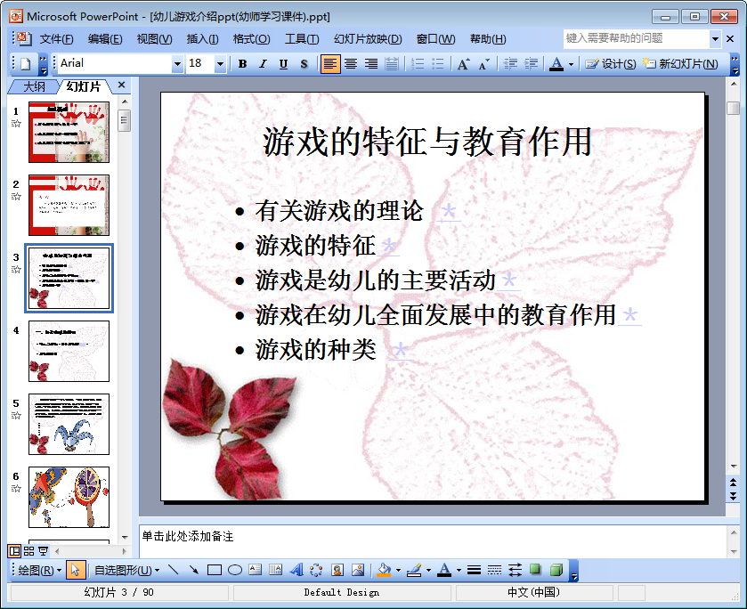 该幼师学习课件之幼儿游戏介绍ppt内容主要包括游戏的特征与教育作用介绍、幼儿园游戏条件的创设、幼儿园各类游戏的特点和指导三大方面,ppt共由90页组成,内容十分全面完整,对“幼儿游戏”这四个字做了十分全面的讲解和说明,想对“幼儿游戏”有更多了解的朋友可以将该ppt下载下来了解一下!