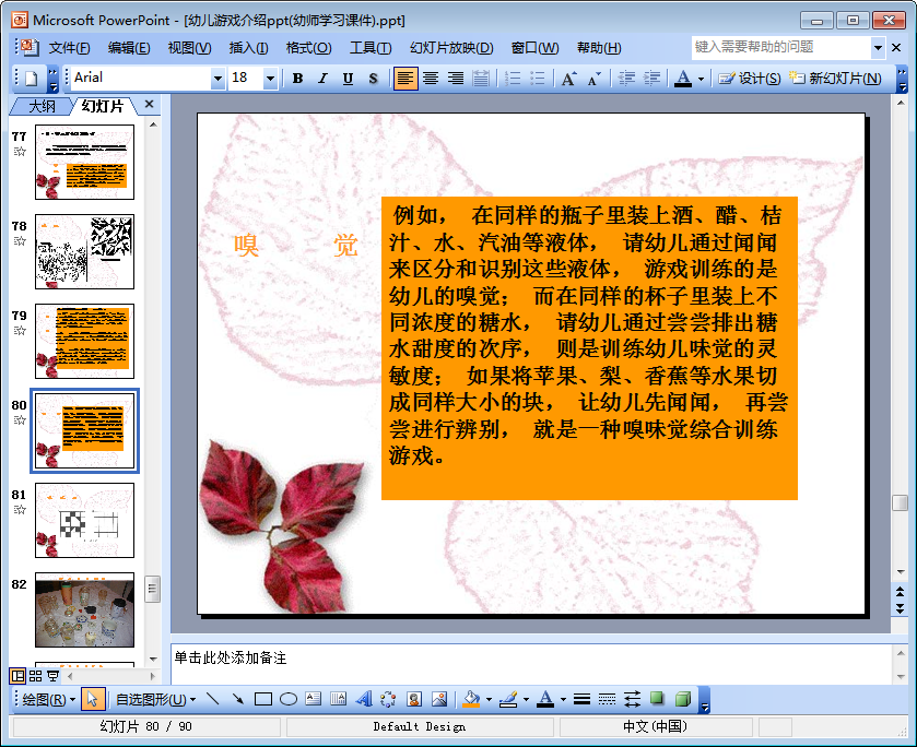 例如, 在同样的瓶子里装上酒、醋、桔汁、水、汽油等液体, 请幼儿通过闻闻来区分和识别这些液体, 游戏训练的是幼儿的嗅觉; 而在同样的杯子里装上不同浓度的糖水, 请幼儿通过尝尝排出糖水甜度的次序, 则是训练幼儿味觉的灵敏度; 如果将苹果、梨、香蕉等水果切成同样大小的块, 让幼儿先闻闻, 再尝尝进行辨别, 就是一种嗅味觉综合训练游戏。