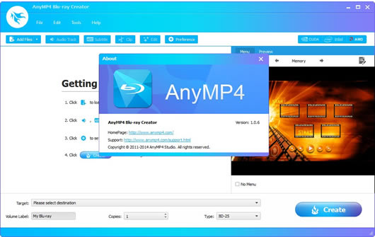 AnyMP4 Blu-ray Creator 允许你可以自由的添加字幕、音轨,并可以利用内置的精美模版来制作专业的蓝光视频光盘的菜单和界面!支持GPU加速,并对NVIDIA? CUDA?, AMD APP Acceleration, Intel? Quick Sync Video Tech等进行了优化!