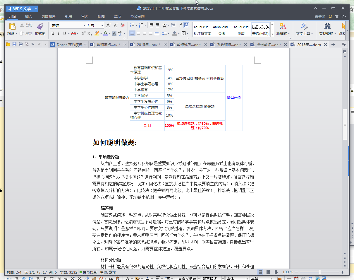 2015年上半年教师资格证考试试卷结构内容节选