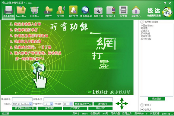 极达快递打印系统是围绕着使用快递发货的操作流程营销屋开发的一套可以减少人力劳动增加工作效率的一个系统,由自动打印、快递单号跟踪、客户信任感友好建立、客户管理及出库单打印等一体的智能软件,有需要的赶紧来下载使用吧。