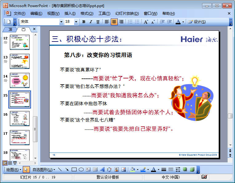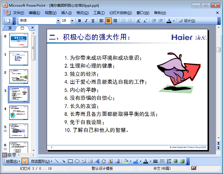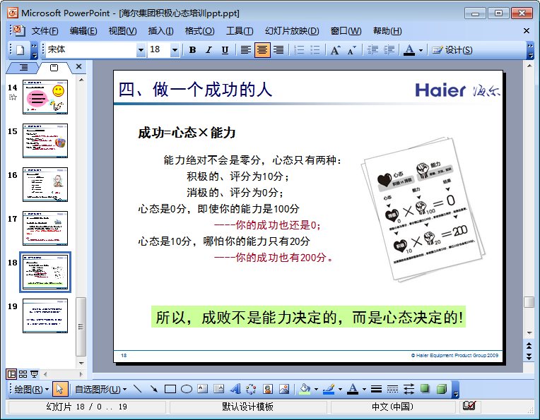这份海尔集团积极心态培训ppt内容包括什么是积极心态讲解、积极心态的强大作用介绍、积极心态十步法、做一个成功的人四大部分,其中的内容积极向上、充满正能量,小编从一名员工的角度表示——看了这份海尔集团积极心态培训ppt之后,整个人更加积极呢!——小编的意思是工作起来更开心了呢!好了,如果你需要这份员工积极心态培训ppt的话,那就快来东坡下载吧!