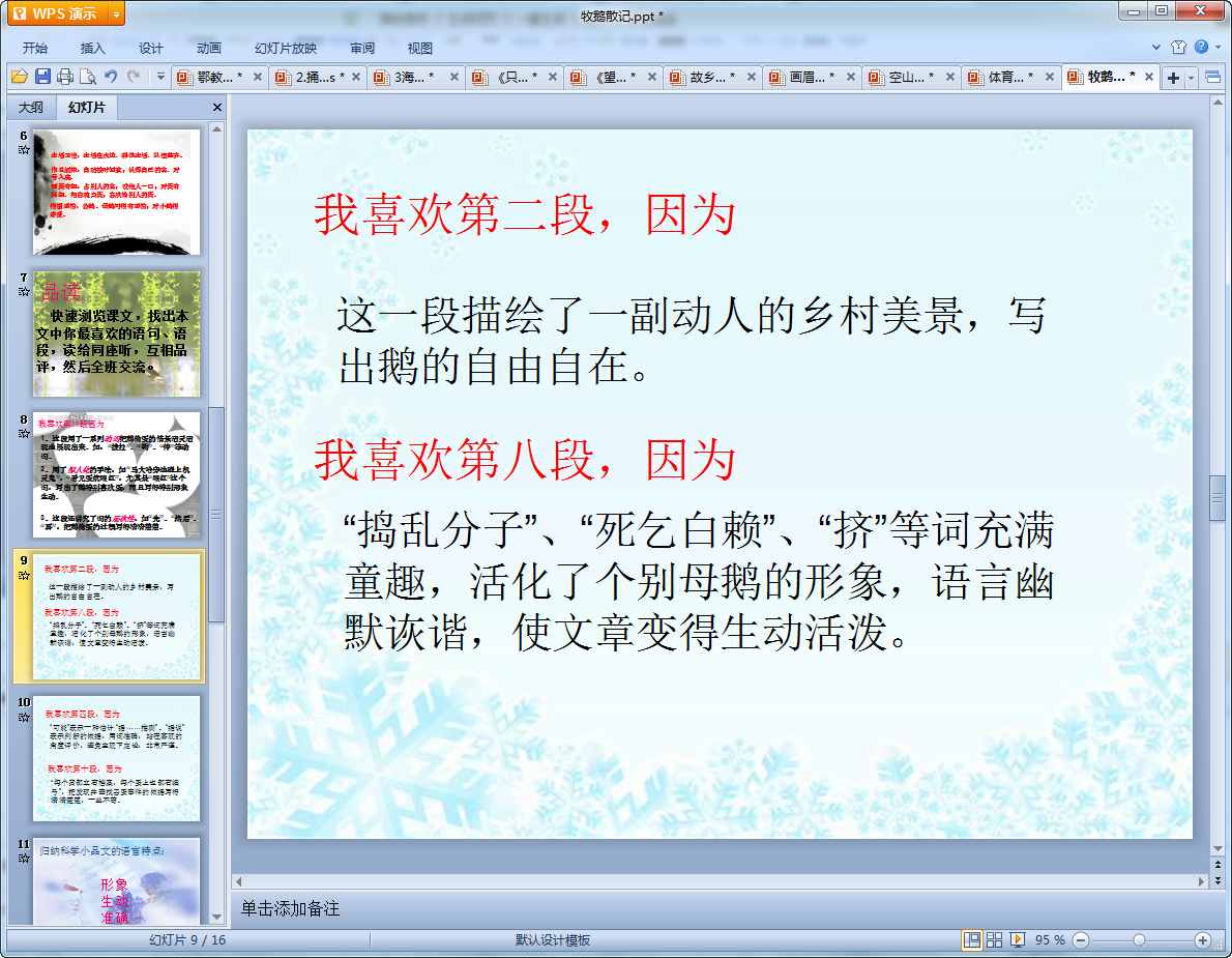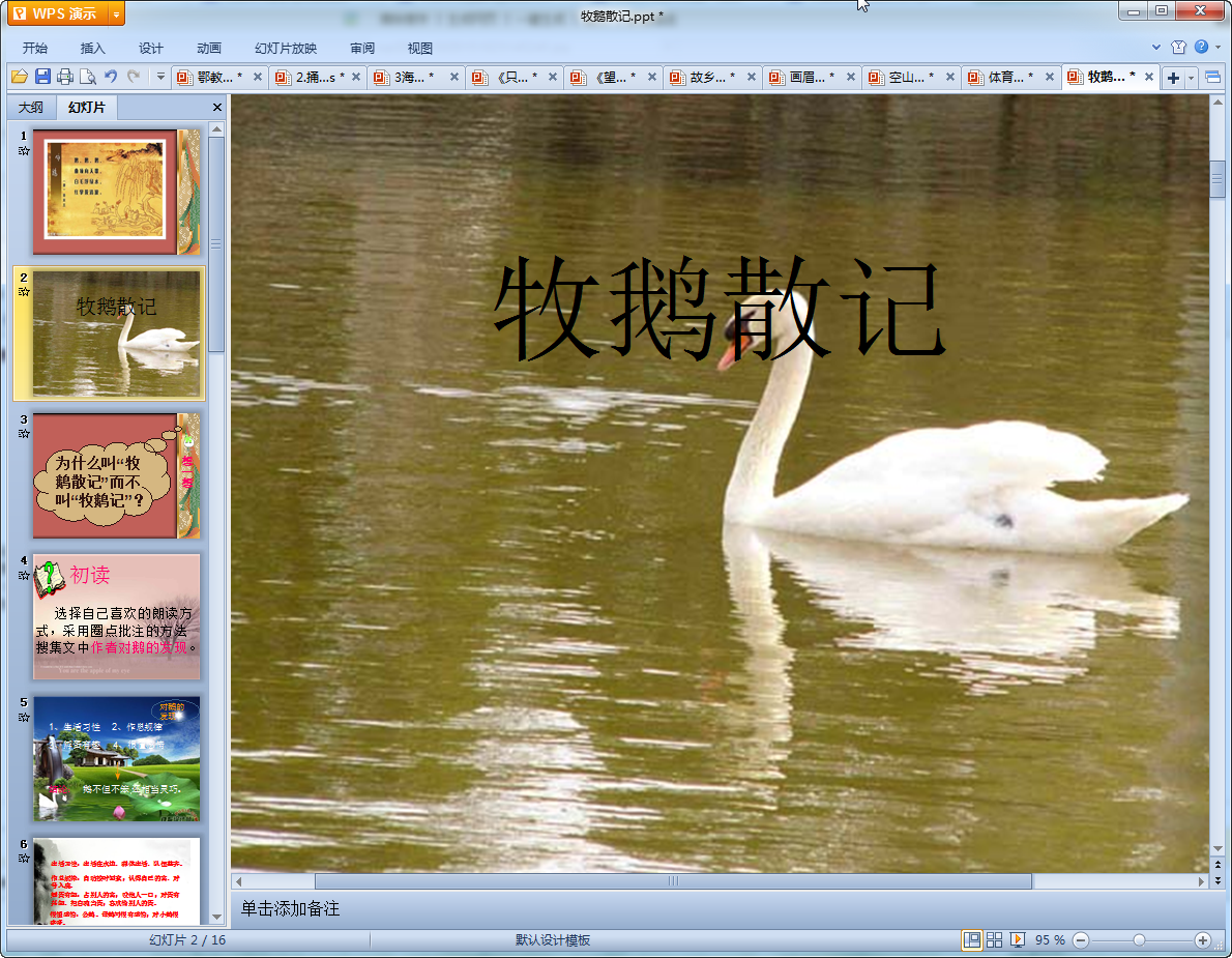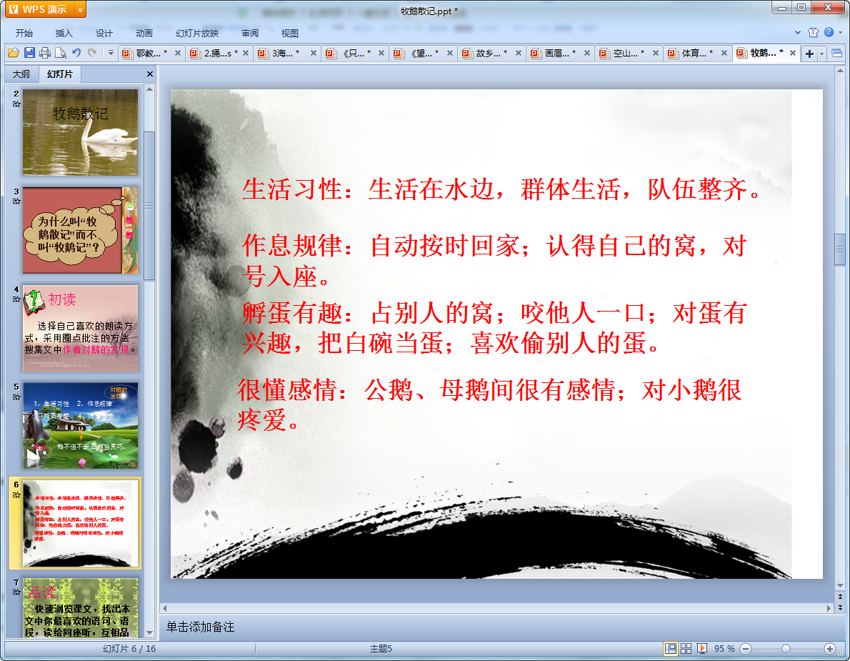 这是由东坡下载编辑整理的牧鹅散记教学课件ppt,该课件共有16页,内容制作精细对文章中的知识点归纳的十分清楚,是一片伸手老师喜欢的教学课件,有需要的朋友们可以来下载使用!