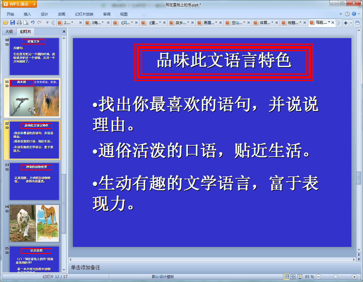 这是一篇初中语文写在雪地上的书教学课件,该课件共有17页内容丰富大量的动物配图深深的吸引了学生们,老师们使用这篇教学课件肯定是事半功倍,有需要的老师们可以来下载使用,不会让您失望!
