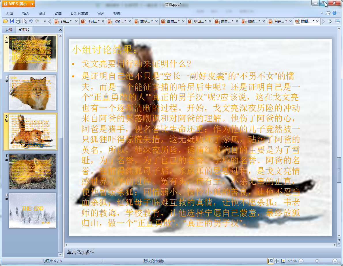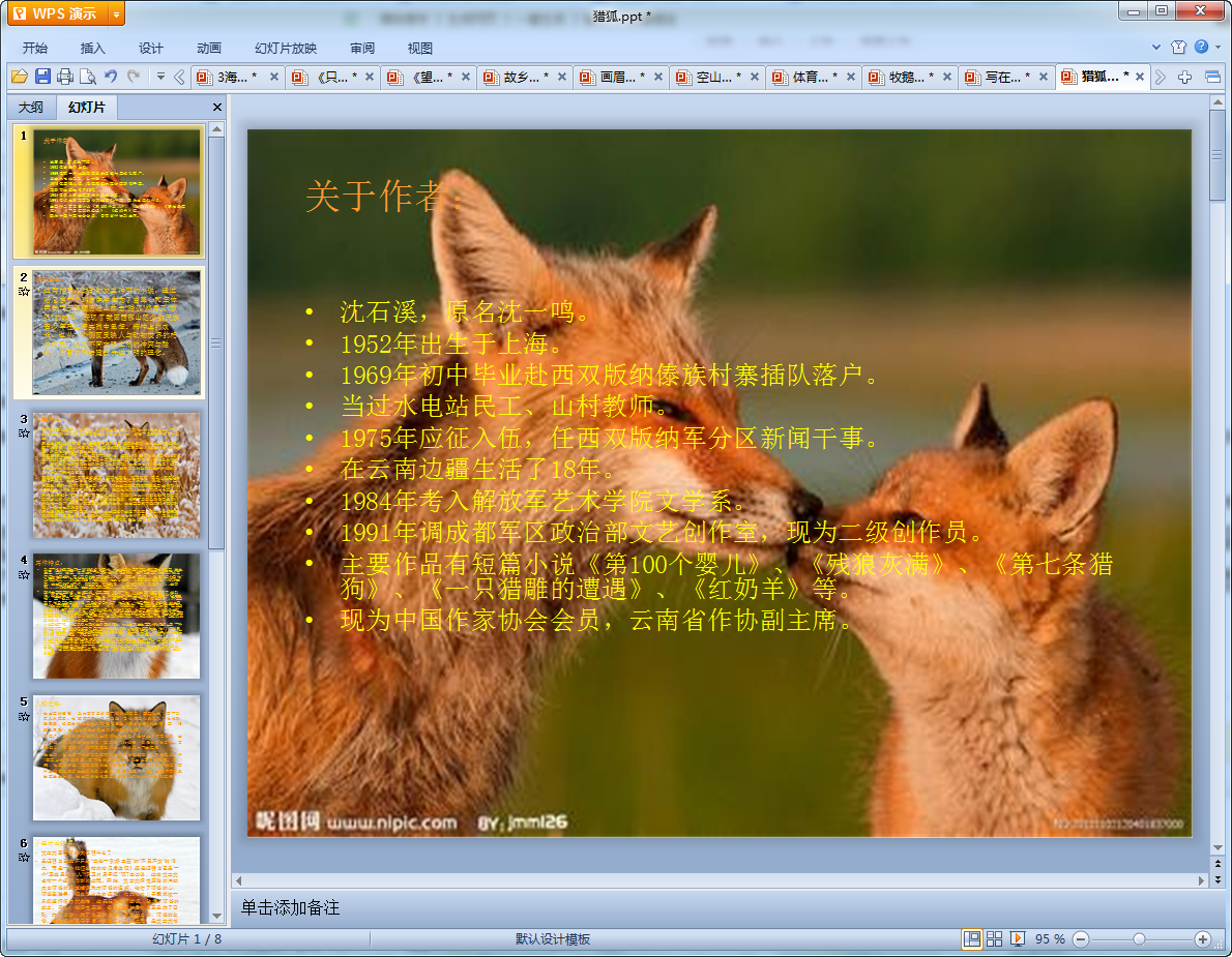 这是一篇鄂教版八年级语文猎狐教学课件,该课件制作精美内容丰富对课本中的知识点归纳完整,虽然只有8页但也深受老师们的喜欢,有兴趣的朋友们可以来下载使用!不会让您失望。