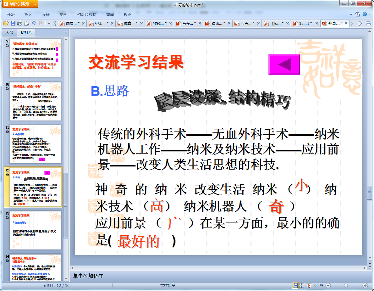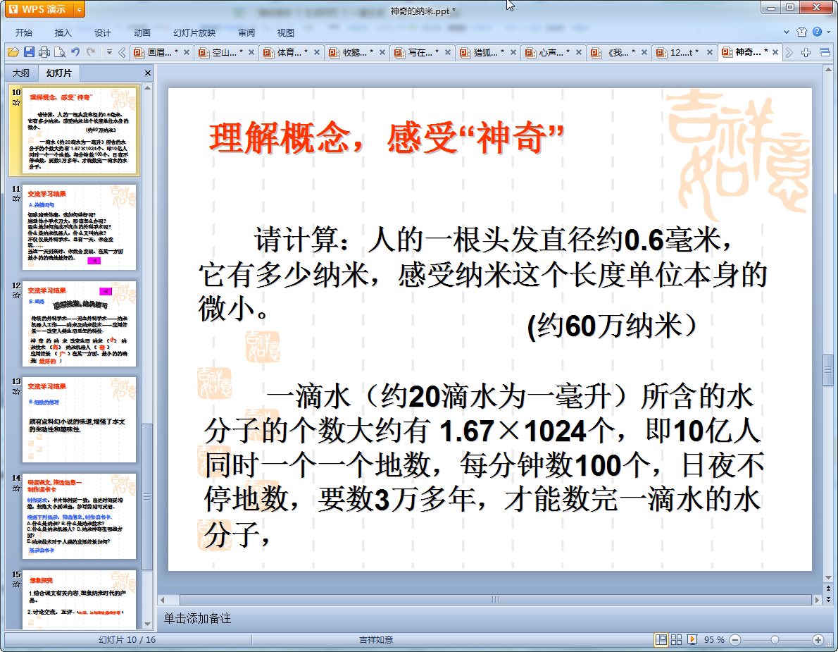 这是一篇初中语文中的神奇的纳米教学课件,该课件共有16页,精美的制作加上大量的图片让整个课件看去来很精彩,具有吸引力有兴趣的朋友们可以来看看,我们东坡为大家提供了免费的下载!