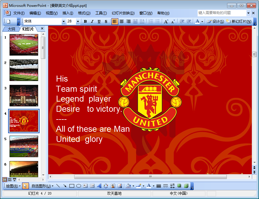 这是一份用英文介绍曼联的ppt,该ppt对曼联的历史、历任优秀球员等做了详细介绍,如果你需要一份相对来说还算完整的、用英文介绍曼联的ppt,那么这份曼联英文介绍ppt无疑是你的不二之选,该ppt内容全面且免费,有需要的朋友可以放心下载!