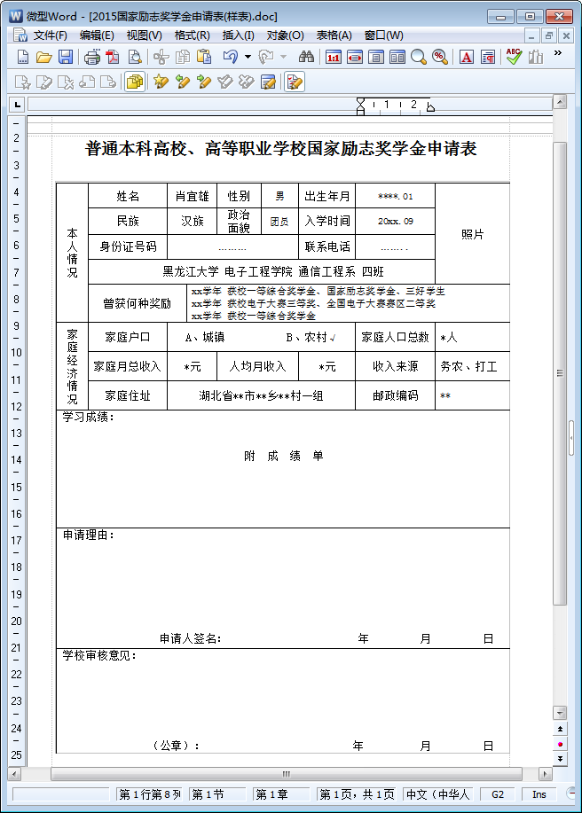 2015国家励志奖学金申请表(样表)预览图