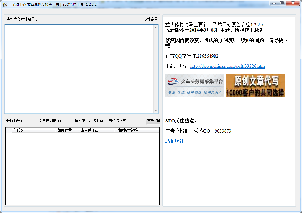 了然于心文章原创度检测工具是一款可以检测文章是否是原创的一个工具。非常的实用。操作简单。有需要的可以来东坡下载使用!