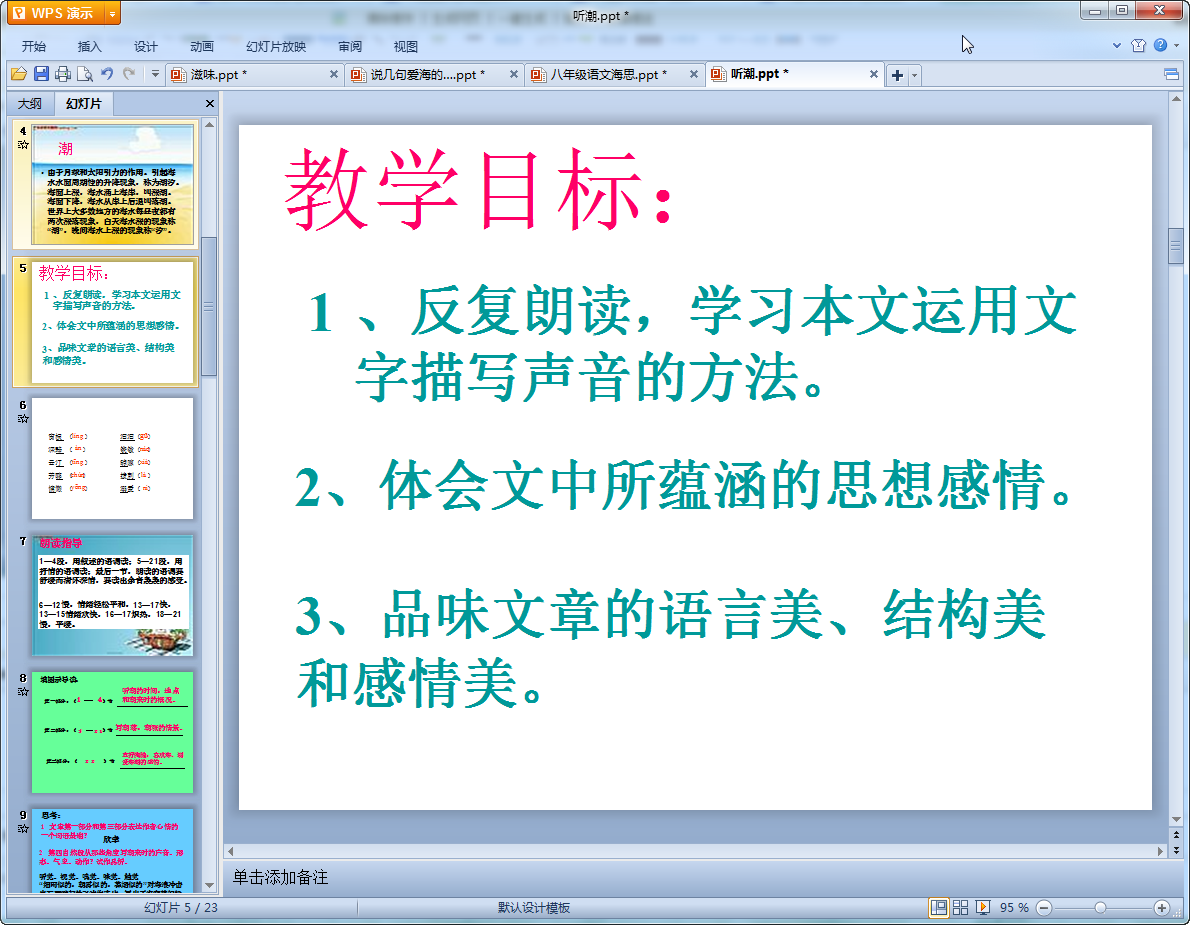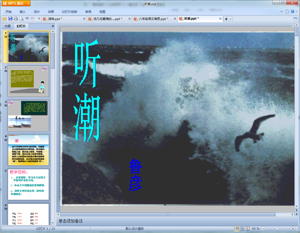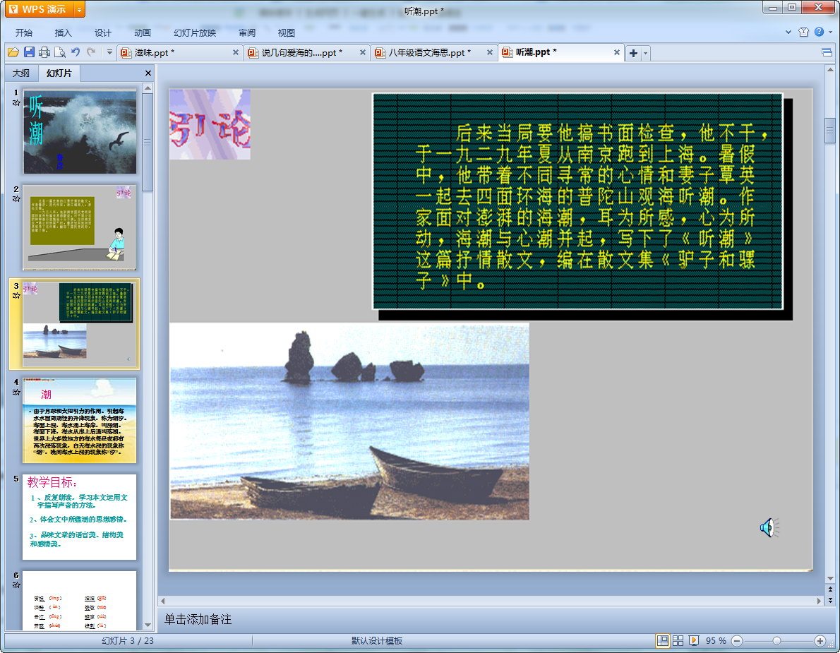这好似有东坡下载站编辑整理的听潮教学课件,该课件共有23页,制作精美对课文的归纳分析十分详细,非常不错的教学课,有兴趣的老师们可以来看看,不会让您失望我们为大家还提供了免费的下载!