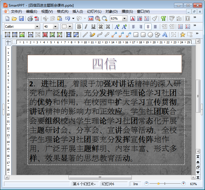 2.进社团。着眼于加强对讲话精神的深入研究和广泛传播,充分发挥学生理论学习社团的优势和作用,在校园中扩大学习宣传贯彻讲话精神的影响力和正效应。学生社团联合会要组织校内学生理论学习社团常态化开展主题研讨会、分享会、宣讲会等活动。全校学生理论学习社团要充分发挥宣传阵地作用,广泛开展主题鲜明、内容丰富、形式多样、效果显著的思想教育活动。