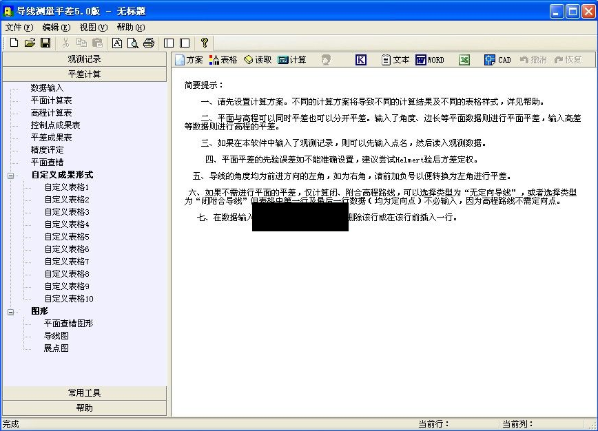 5.成果的打印与输出。软件本身直接支持显示、打印,表格还可输出到WORD和文本文件,图形可输出到AutoCad及其它成图系统。 输出到WORD的表格支持向下错开半行的格式。