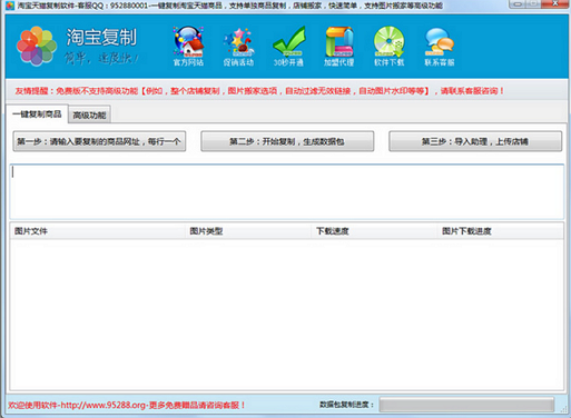 95288淘宝天猫店铺复制软件使用的是淘宝的官方接口,几乎100%的可以正确下载宝贝属性!您再也不必手动一个一个上传宝贝了!分分钟就能上货几千个宝贝! 使用最简单的淘宝复制软件,你造吗?3个步骤鼠标点点就轻松上货几千个宝贝!完全不像有些店铺克隆软件,需要手动操作很繁琐。 使用95288淘宝天猫店铺复制软件可以复制多张主图,多线程下载图片,速度就是快!完美下载淘宝商品的销售属性,导出文件支持淘宝助理各个版本,兼容性好,是您淘宝开店的必备工具软件。 使用95288淘宝天猫店铺复制软件,上货和世界杯一个都不落下!
