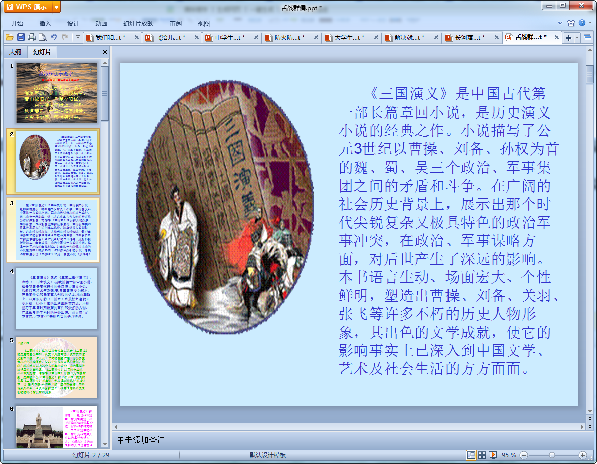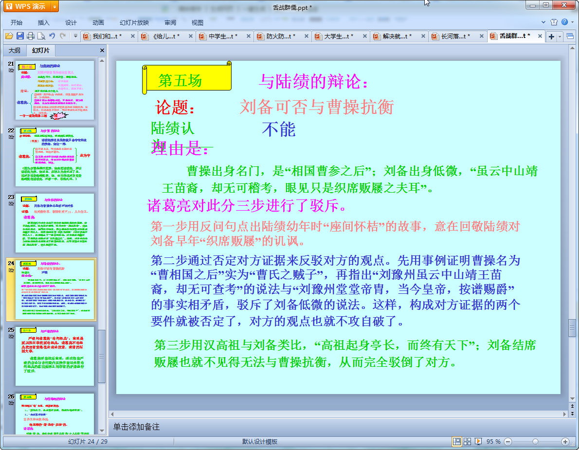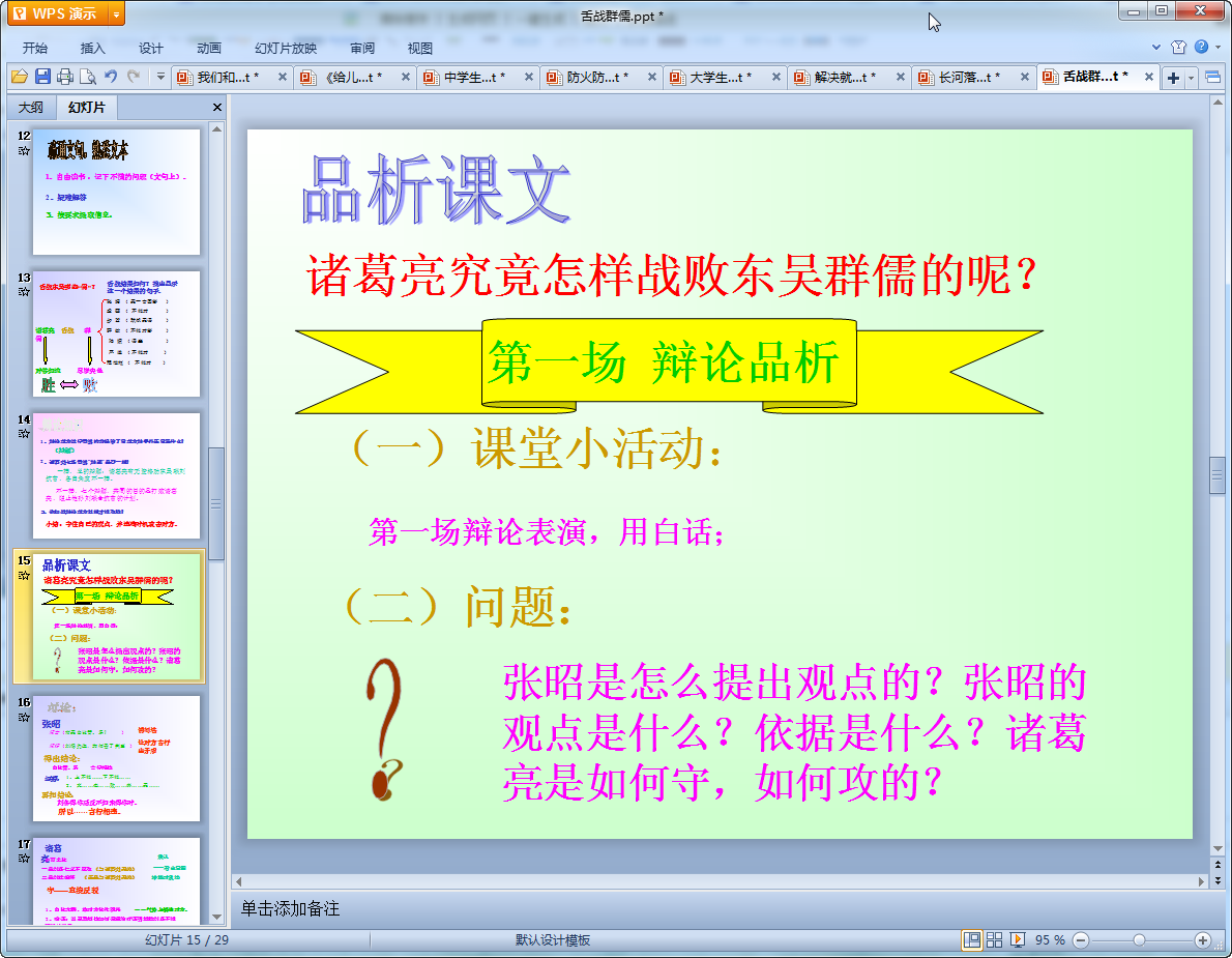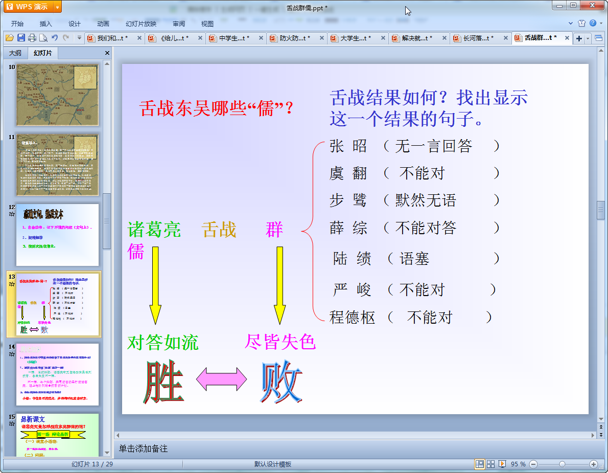 这是有东坡下载站编辑整理的舌战群儒教学课件,该课件共有29页内容比较丰富,对课本中的重难点介绍也十分清楚,非常不错的教学课件,另外还大篇幅的讲解了三国演义的介绍,有兴趣的老师们可以来下载使用!