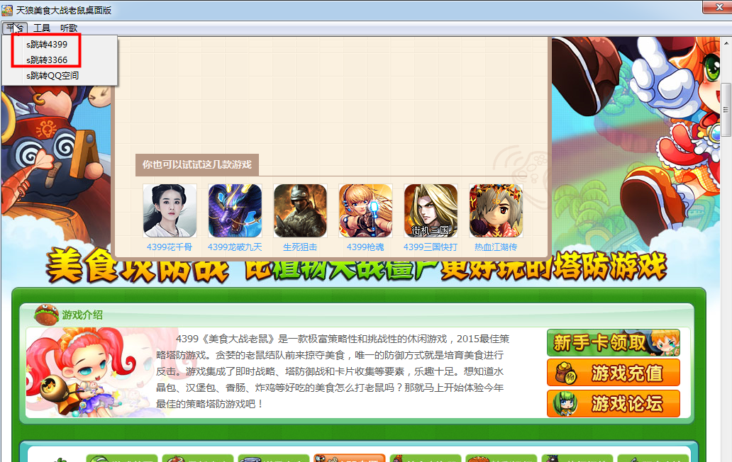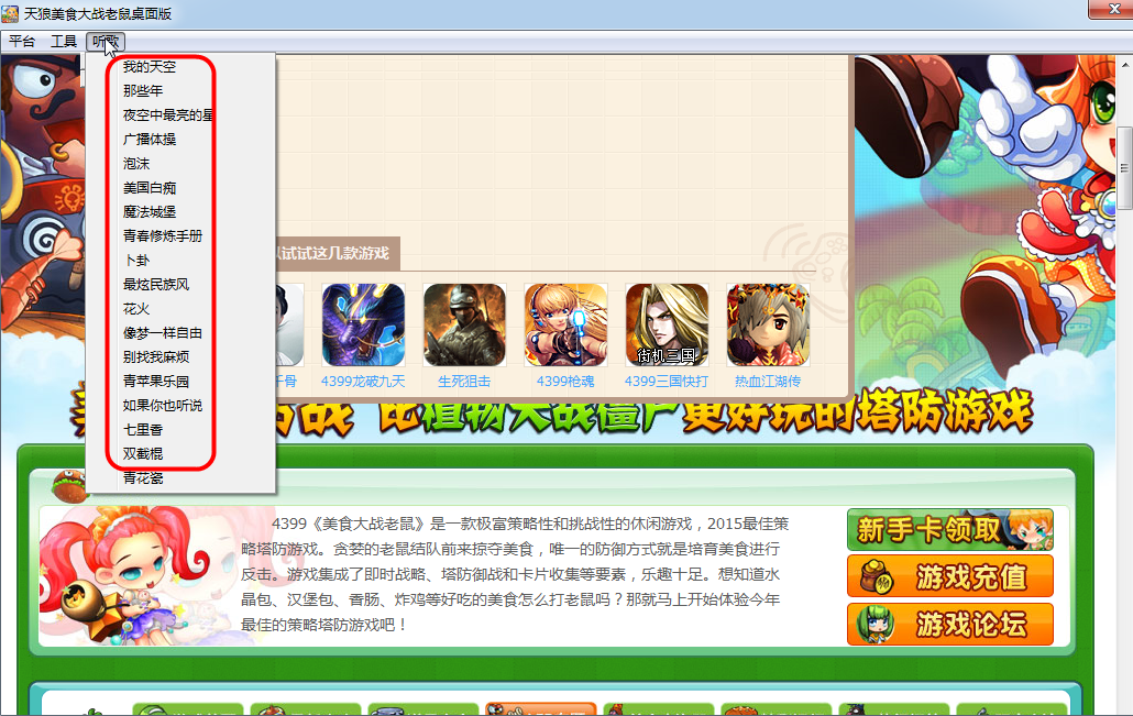 对于喜欢玩美食大战老鼠,又不能缺少音乐的朋友来说,想要两全其美!那么就只有选择天狼美食大战老鼠桌面版,不但保证你们稳定的进行游戏,而且还能够在游戏中听高品质的歌曲,这个真是值得下载的!