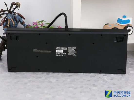海盗船STRAFE红轴机械键盘背部同样为磨砂塑料材质,撑脚采用了更加人性化的左右开合设计,这样可以保证用户在向前推键盘时不会出现撑脚意外闭合的情况。键盘底部采用了四个长条状橡胶防滑垫,虽然比较小,但是提供的摩擦力足够出色。
