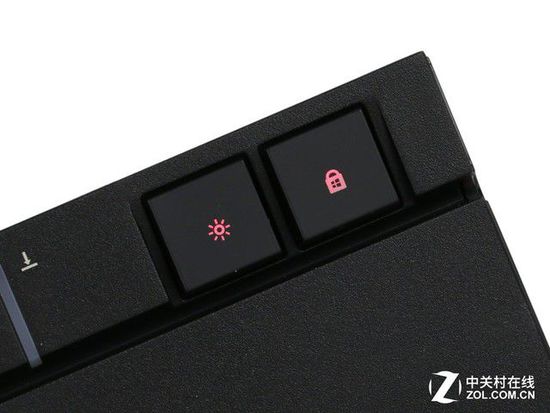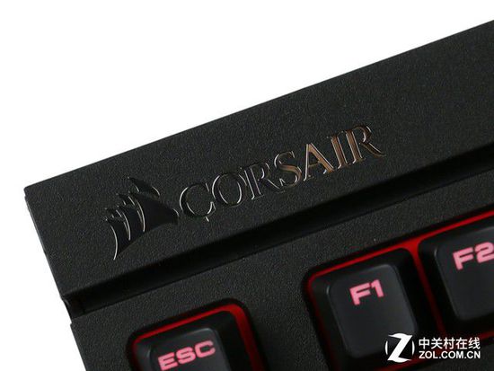 键盘顶部设计有一个弧度,左上角为海盗船新logo铭牌,右上角则是细长条的指示灯,视觉效果相当炫酷,然后便是两枚功能按键,包括背光调节以及锁win功能键。