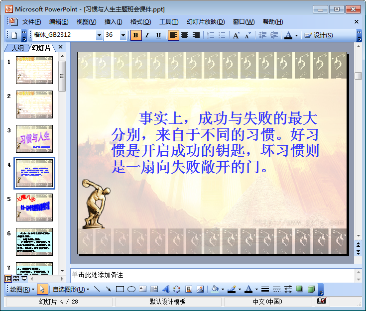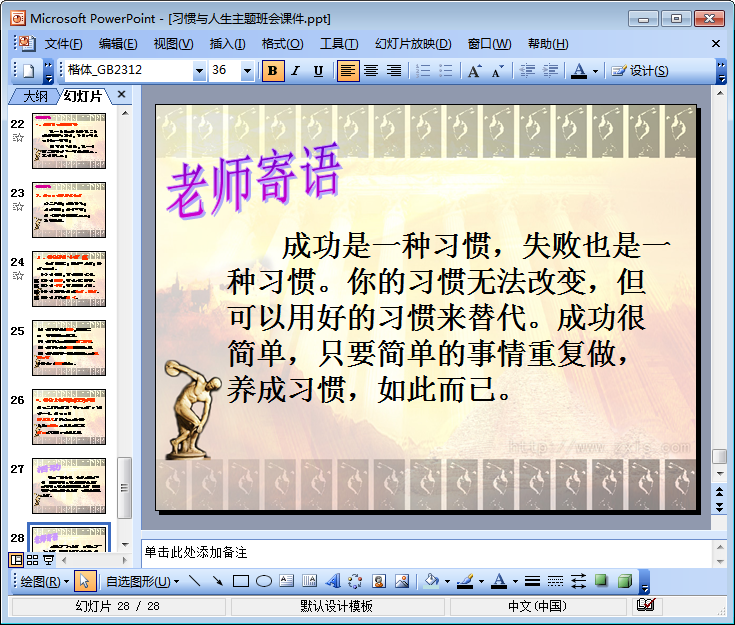 习惯与人生之间到底有着怎样的联系呢?——如果你想要找到这一问题的答案,那么不妨就来这份习惯与人生主题班会课件ppt(以下简称为习惯与人生ppt)中找寻吧!该ppt共有28页,内容完整全面,“成功是一种习惯,失败也是一种习惯。”——希望这样一份习惯与人生ppt能对大家有所帮助或启迪!