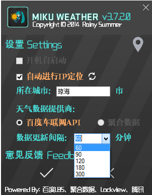 1. 采用百度lbs车联网天气查询接口,数据准确、广泛,支持全国全部地级市(除港澳台外),外加外国首府及个别特大城市。还可以自定所在城市及更新数据的频率。