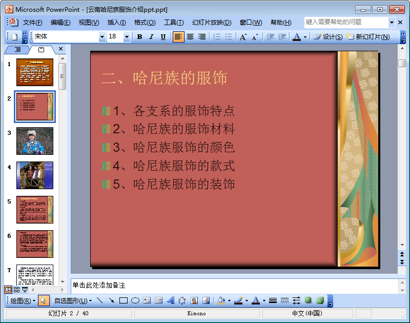 哈尼族是我国一个古老的民族,该民族多居住在半山腰,哈尼族的人们崇尚黑色——既然如此的话,那么这一点在他们的服装中又是如何来体现的呢?本节内容小编为大家整理带来的是一份云南哈尼族服饰介绍ppt,ppt内容包括哈尼族各支系的服饰特点介绍、哈尼族的服饰材料介绍以及哈尼族服饰的颜色、款式等相关介绍,希望这样一份ppt能对大家有所帮助!