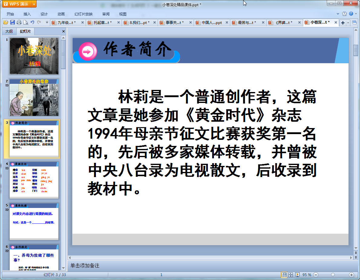 林莉是一个普通创作者,这篇文章是她参加《黄金时代》杂志1994年母亲节征文比赛获奖第一名的,先后被多家媒体转载,并曾被中央八台录为电视散文,后收录到教材中。