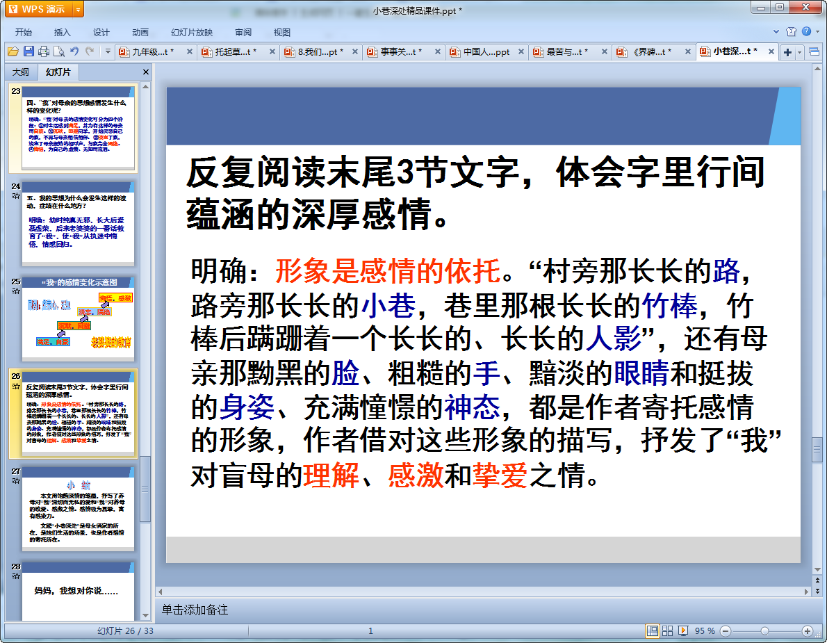 这是由东坡下载站编辑整理的小巷深处教学课件,该课件共有33页内容丰富对课文讲解详细,课文中盲母在生活中对养女的深沉无私而又无微不至的爱,读来感人至深。有兴趣的老师朋友们可以来免费的下载使用!