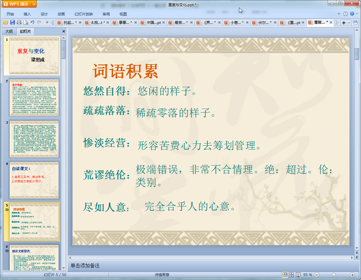 这是一篇鄂教版九年级语文重复与变化教学课件,该课件共有50页内容丰富对课本中的知识点讲解的十分清楚完整,后面还配有大量的建筑配图非常不错的教学课件,有需要的老师们可以选择来下载使用!