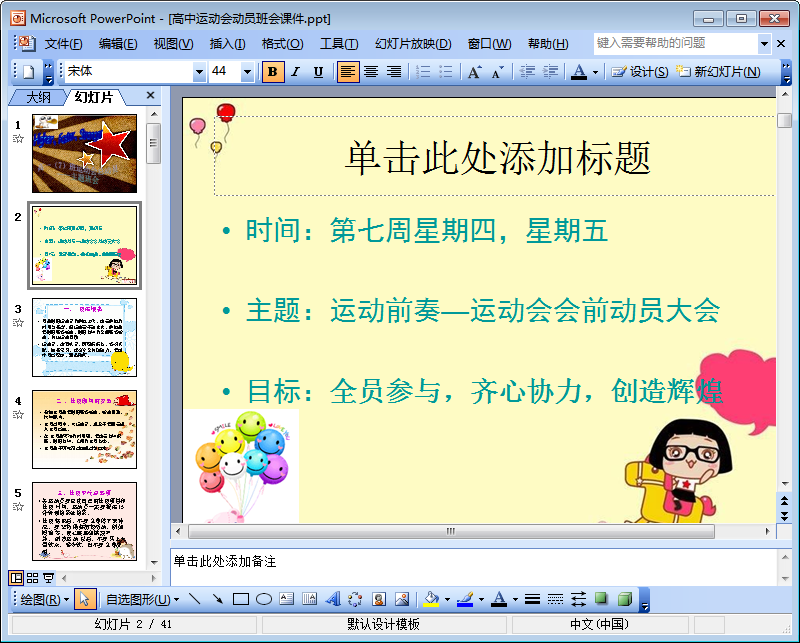 要开运动会啦!咱们一起吧!小编在本节内容中和大家分享的是一份高中运动会动员班会课件(以下简称为运动会动员班会ppt),该ppt内容积极向上,充满青春活力和趣味性,作为运动会动员班会ppt进行选取使用是极好的,有需要的朋友们点击本文相应的下载地址即可进行下载查阅该ppt的全部内容。