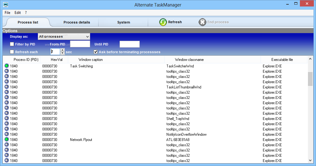 此外,您可以复制一个进程的ID复制到剪贴板,终止一个或多个选定的过程和实施这一行动禁用确认信息,以及只显示过程或无窗口标题,或分组。