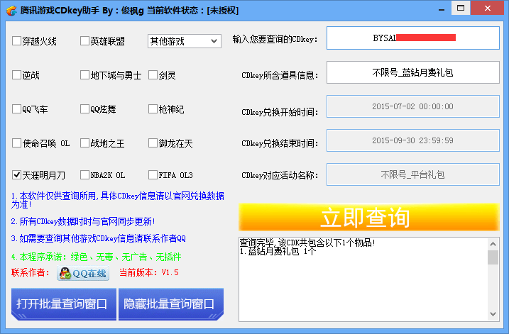 此工具100%可以免费查询、兑换天涯明月刀cdkey兑换码,当然,还包括腾讯的一些其他网络