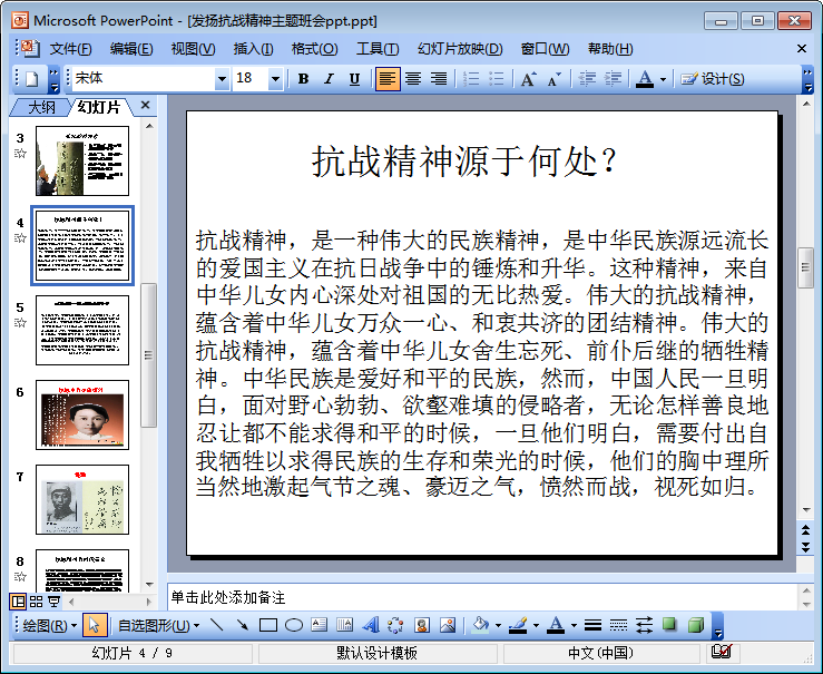 何为抗战精神?抗战精神又应该如何来进行发扬呢?小编为大家整理带来的这份发扬抗战精神主题班会ppt就这些问题进行了详细的介绍和说明,需要发扬抗战精神主题班会ppt或是抗战精神ppt模板的朋友们小编建议你可以参考一下该ppt。