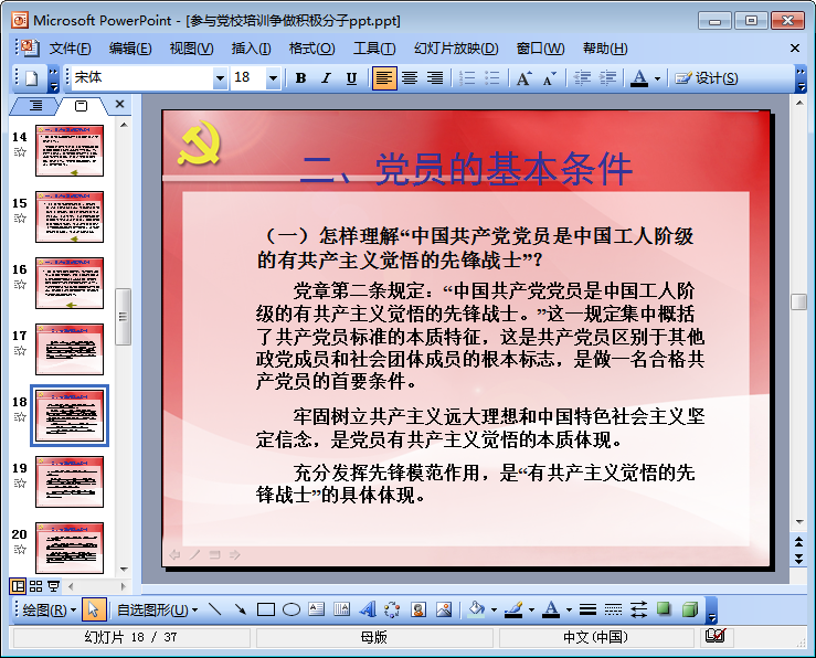 你知道入党动机及分类吗?你知道树立入党动机的意义吗?你了解共产党员的起码条件吗?如果你表示对这些问题你都无从知道的话,那么你是时候看看这份共由37页组成的参与党校培训争做积极分子ppt了,该ppt除了对上述问题做了解答外,其中的内容还包含有党员的基本条件介绍等,欢迎有需要的朋友们前来下载查阅!
