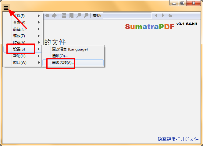 打开此开源PDF阅读器后,点击左上角,那是菜单栏,然后依次“设置”--“高级选项”