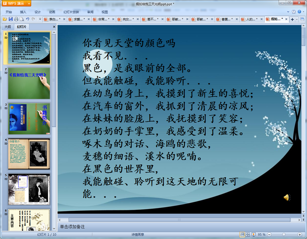 这是由东坡下载站编辑整理的假如给我三天光明教学课件,该课件共有10页制作精美,简述的介绍了全文,对课文中的重难点归纳的十分清楚,有需要的老师们可以来这边看看,我们为大家提供了免费的下载!