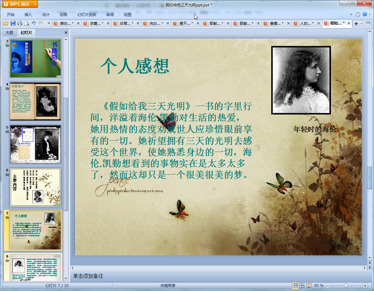 《假如给我三天光明》一书的字里行间,洋溢着海伦.凯勤对生活的热爱,她用热情的态度劝戒世人应珍惜眼前享有的一切。她祈望拥有三天的光明去感受这个世界,使她熟悉身边的一切,海伦.凯勤想看到的事物实在是太多太多了,然而这却只是一个很美很美的梦。