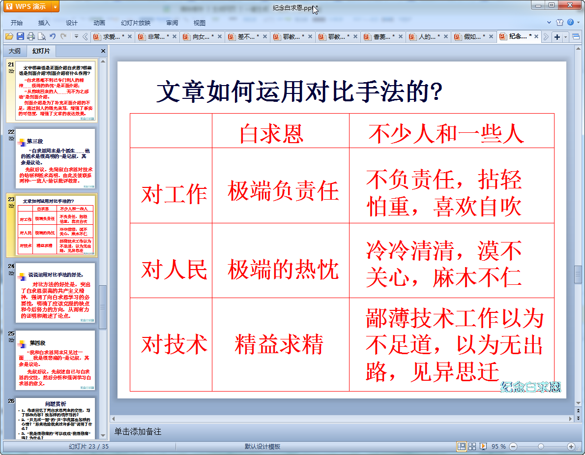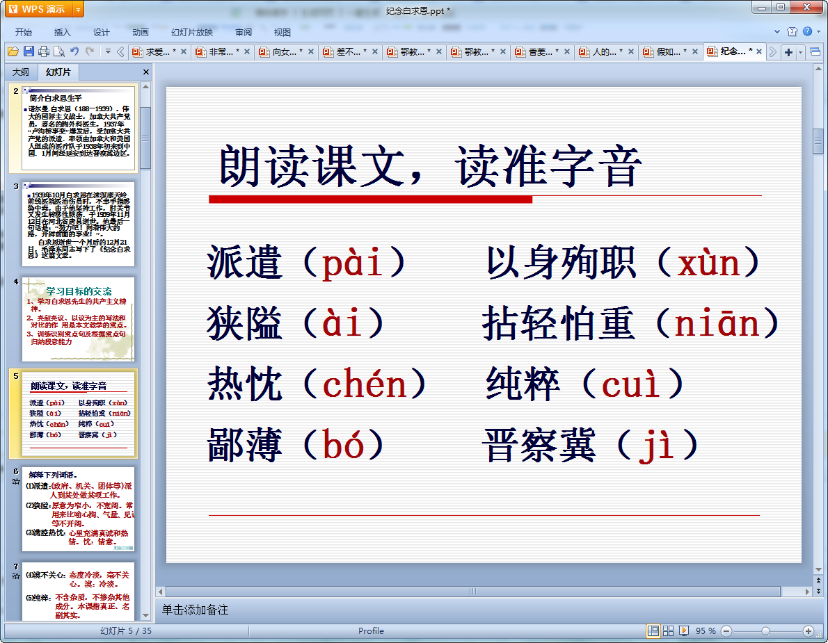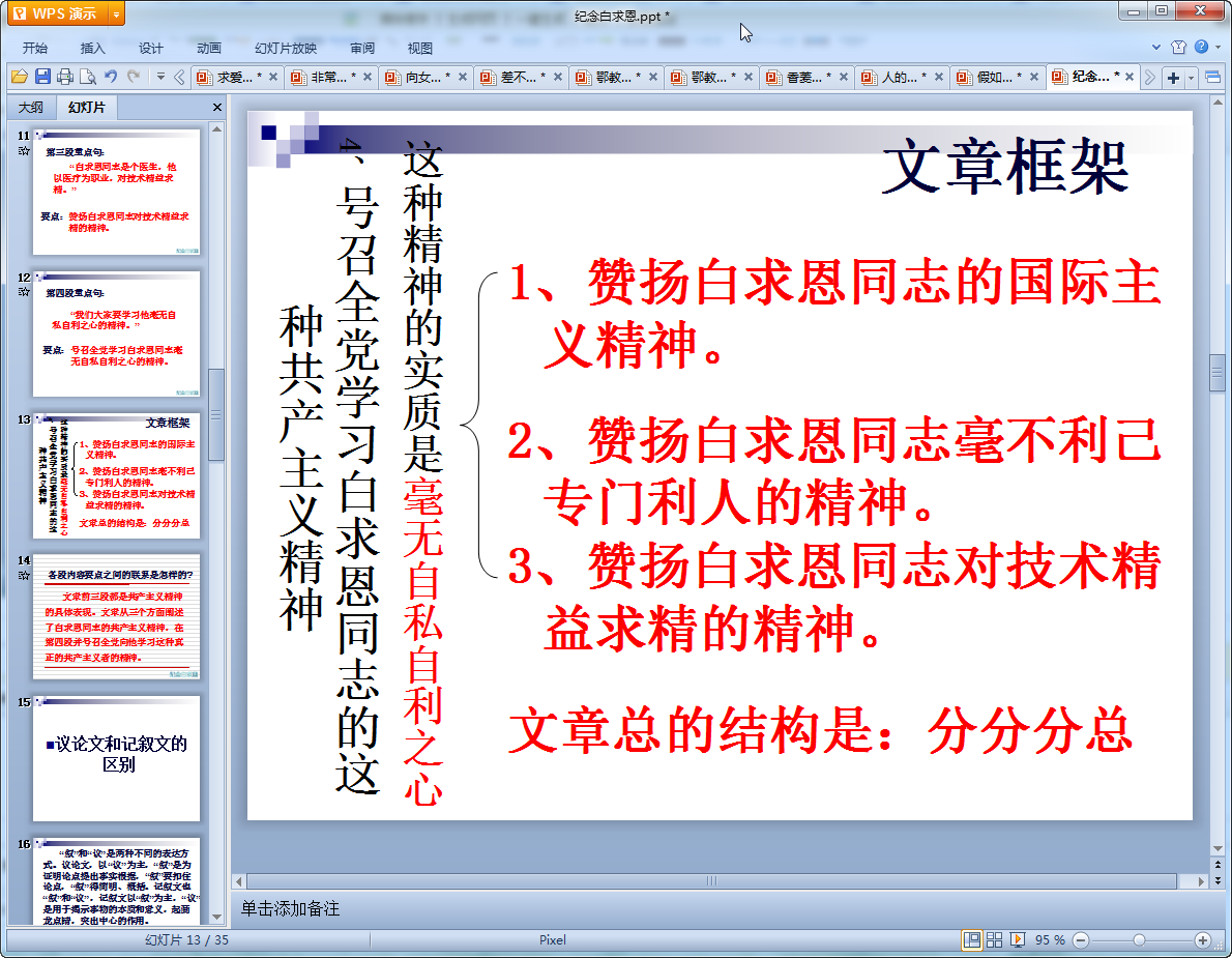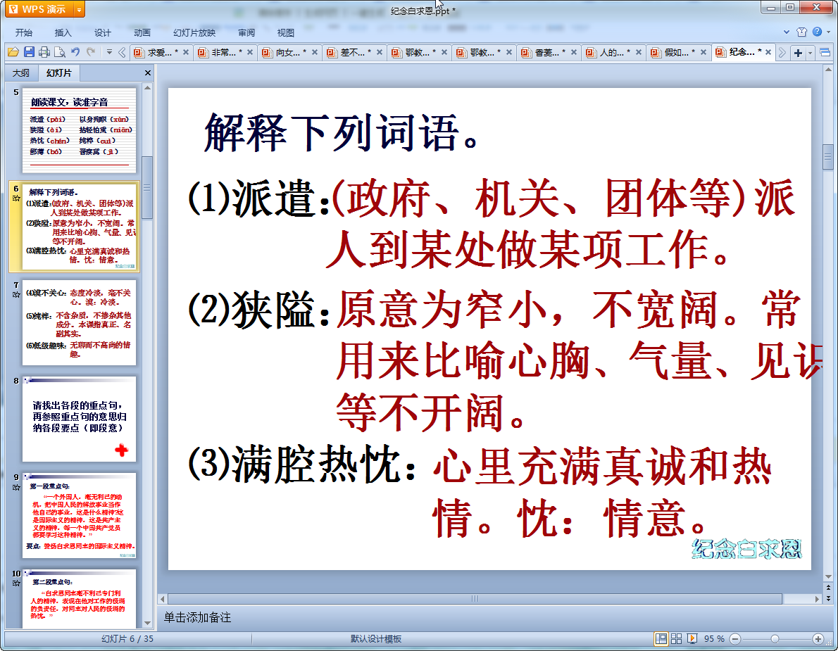 这是一篇语文纪念白求恩教学课件,课文中讲解了白求恩的国际主义精神,该课件共有35页对课本中的知识点讲解详细全面,需要的该课件的老师只需将该课件加以润色就能使用,欢迎大家前来下载使用!